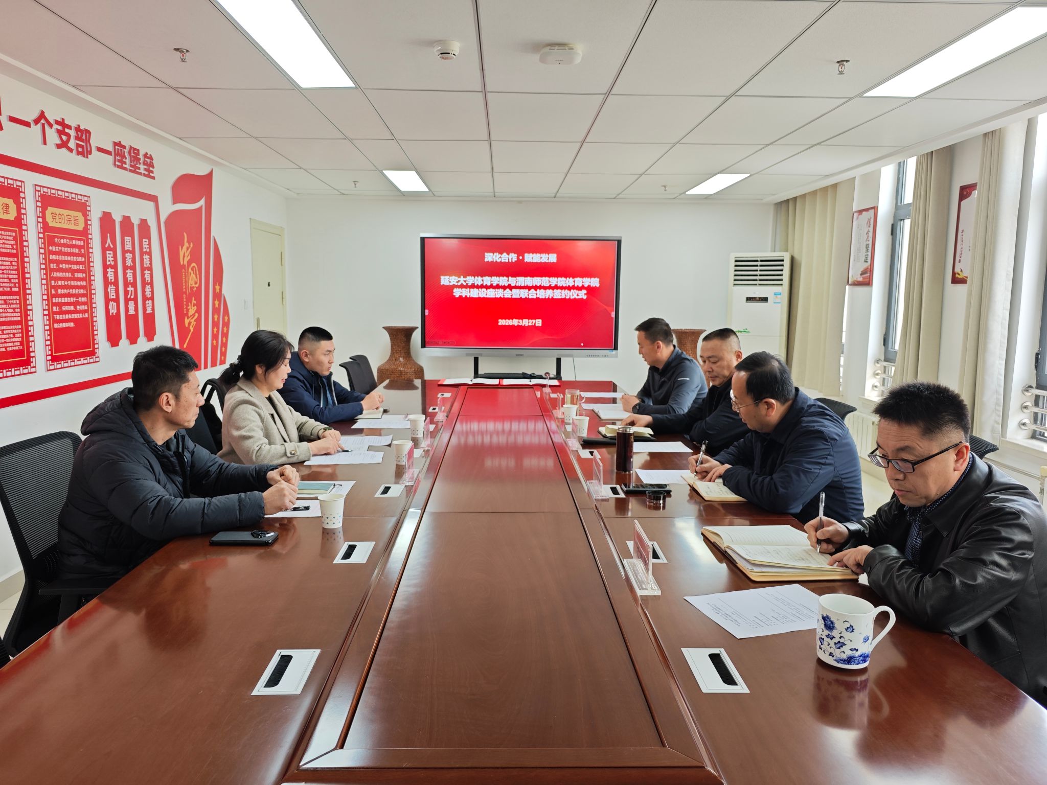 3月27日下午,我院与渭南师范学院体育学院在党员活动室举行了学科专业建设交流座谈会,渭南师范学院体育学院院长李春兰、副院长杨枭、体育教育专业负责人李伟,我院党委书记兰鸿涛、院长宗有智、副院长宗延伟参加了会议,会议由副院长薛亚东主持。