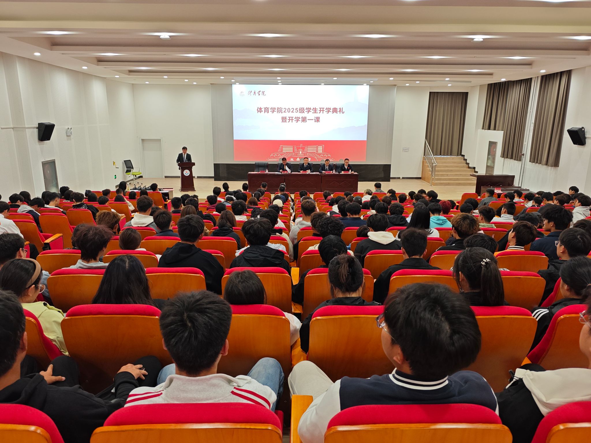 9月21日上午,体育学院在新校区大学生活动中心举行了2025级新生开学典礼暨开学第一课。学院领导班子成员、教师代表、辅导员班主任以及2025级本科生、研究生参加。开学典礼由学院党委副书记徐海阔主持。