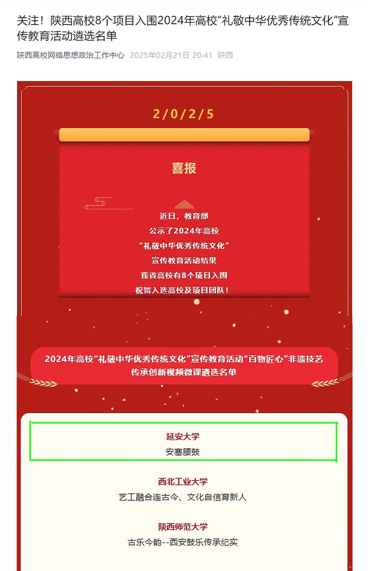 近日,教育部公布了2024年高校“礼敬中华优秀传统文化”宣传教育活动“百物匠心”非遗技艺传承创新视频微课遴选名单,延安大学报送的《安塞腰鼓》视频微课成功入选。安塞腰鼓,作为第一批国家级非物质文化遗产,以其磅礴的气势、精湛的技艺和深厚的文化内涵,成为了中国民间艺术的璀璨明珠,享有“天下第一鼓”的盛誉。延安大学自2000年起开设体育专业选修课程,2006年增设体育公共选修课程,2012年成为体育学院专业课程和校级精品课程,2016年成为延安大学体育课程,2019年在学堂在线国家精品教学平台上线,2021年成为研究生教育教学改革项目,2022年成为延安大学继续教育教学改革课程思政样板课项目,2023年获批为陕西省特色线上课程,2024年获批为陕西省线上一流课程,2025年被列为陕西省普通高校中华优秀传统文化传承项目。