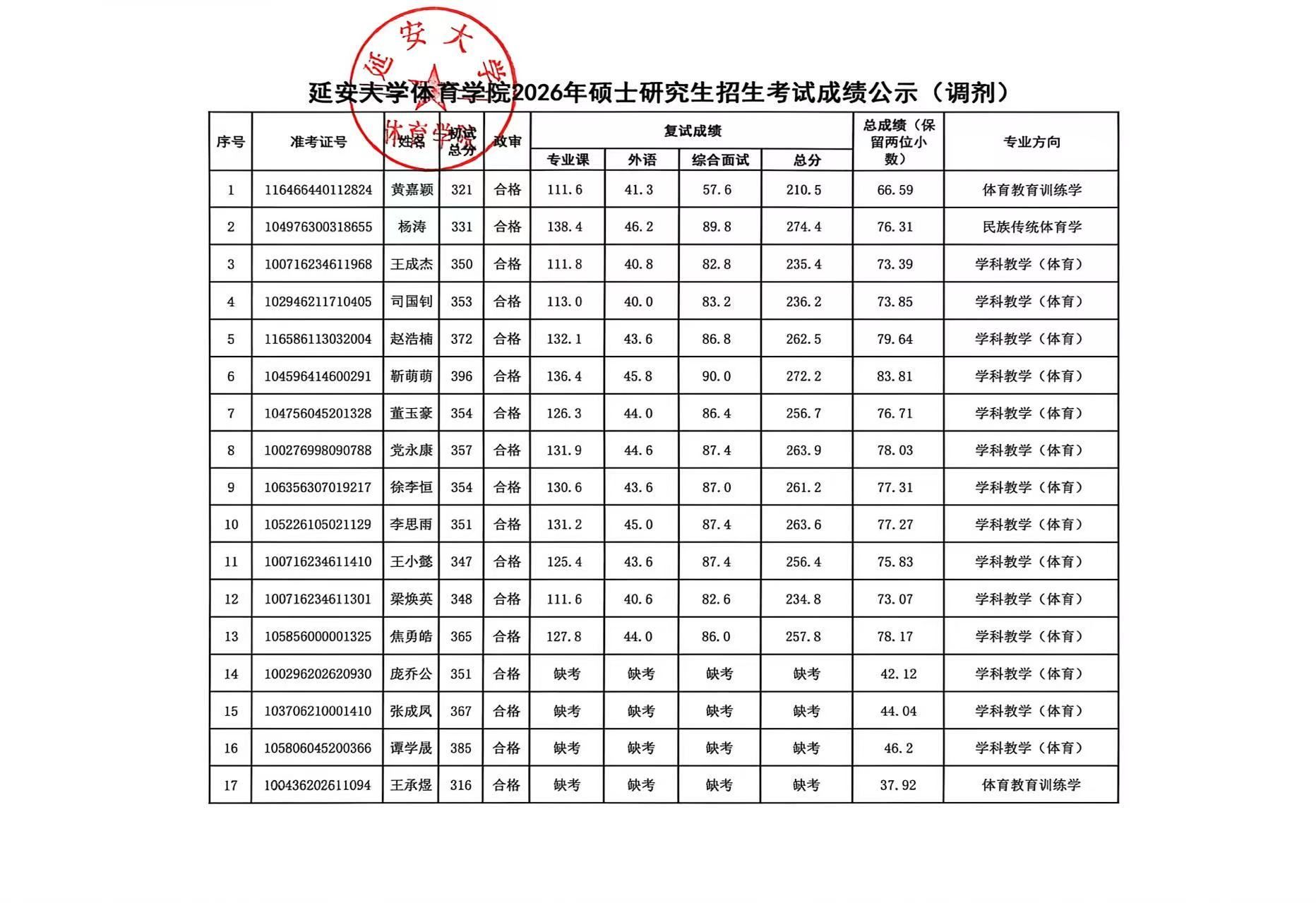 延安大学体育学院于2026年4月10日组织实施硕士研究生第一批次调剂考生复试工作,经上报研究生院审核后,现将录取成绩进行公示(见附件)。公示期为2026年4月10日至4月19日,如有异议,请按照以下联系方式进行咨询。